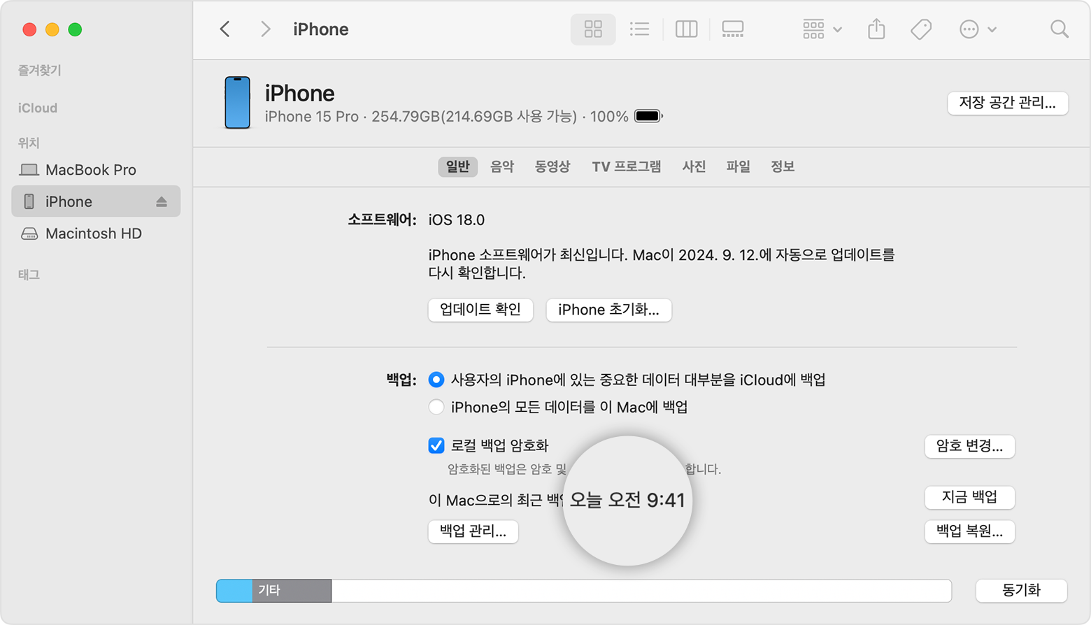 기기 또는 Apple Watch의 건강 데이터와 활동 데이터를 저장하고 싶으면 백업을 암호화해야 합니다. '로컬 백업 암호화' 체크상자를 선택하고 암호를 만듭니다.